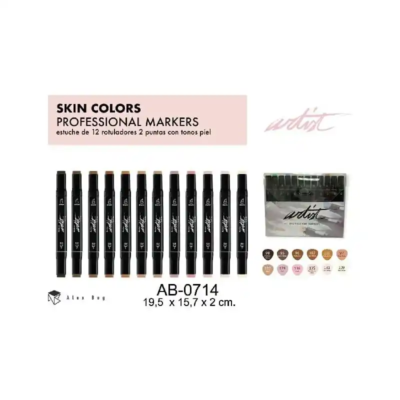 ROTULADORES ARTIST TONOS PIEL ALEX BOGRotuladores doble punta una fina y otra biselada, tinta translucida con base de alcohol que permite la mezcla de colores.Ideal para iniciarse en ilustración.Set 12 colores piel
