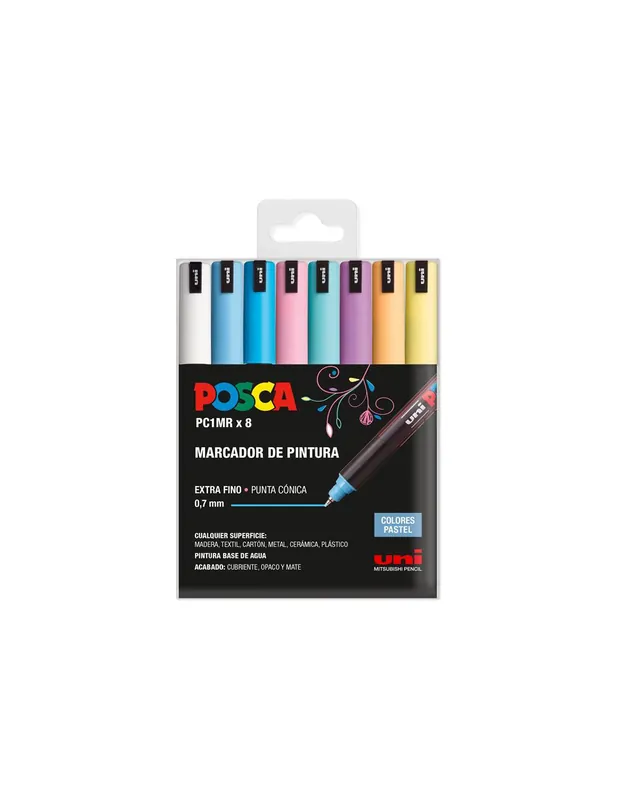 Set de 8 Rotuladores Posca PC1MR/8C Pastel incluye una colección de tonos pastel en una punta de 1 mm, diseñada para ofrecer colores suaves y sutiles en tus proyectos artísticos. La tinta opaca a base de agua garantiza una cobertura uniforme y vibrante, ideal para una amplia variedad de superficies como papel, madera, vidrio y cerámica.