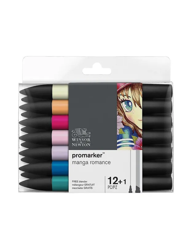 Caja que incluye 12 rotuladores Promarker con una gama de colores románticos y 1 rotulador adicional. Diseñada para ilustradores y artistas que buscan tonos suaves y elegantes para sus trabajos en manga y cómics.