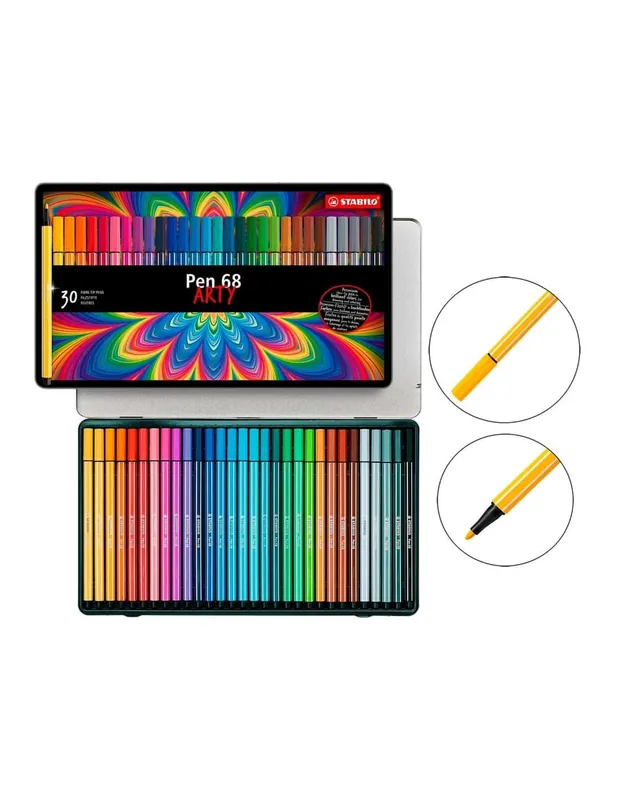 Caja Metal de 30 Rotuladores Stabilo Arty Pen 68 es un set de alta gama diseñado para ofrecer una extensa paleta de colores vibrantes y duraderos en un elegante estuche metálico. Cada rotulador cuenta con una punta de fibra robusta de 1 mm, ideal para crear trazos definidos y consistentes, perfectos para dibujo, caligrafía y técnicas creativas.