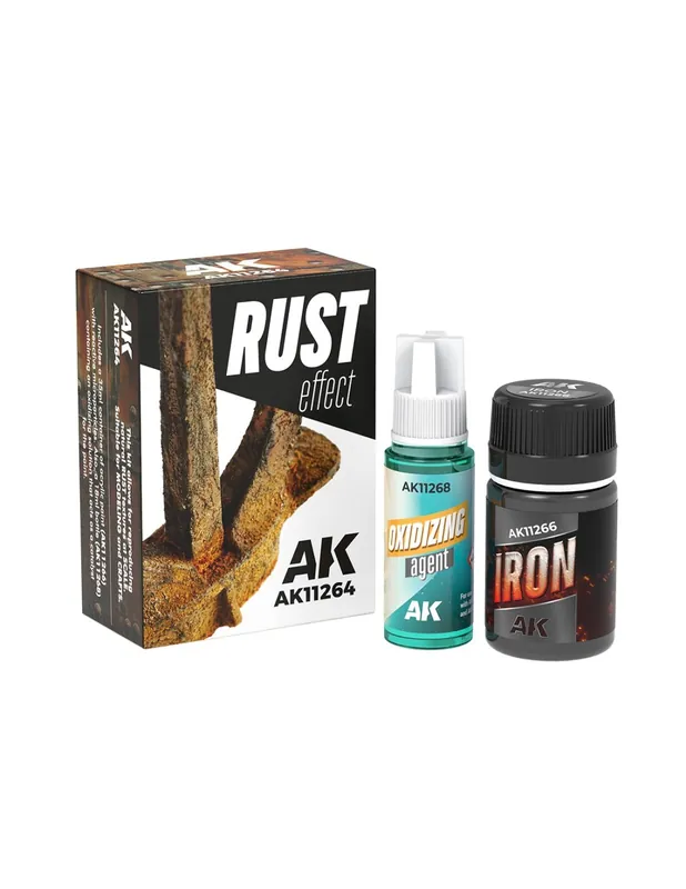 Este kit permite reproducir efectos de óxido a escala muy realistas en modelos y miniaturas. Indicado para modelismo y manualidades.1. Aplica la pintura acrílica especial (AK11266) con un pincel sobre la pieza donde se desee el efecto.2. Una vez seca, aplica el agente oxidante (AK11268)* sobre la pintura.3. Déjalo reposar un tiempo para observar el efecto final, ya que la oxidación ocurre debido a una reacción natural con el aire.* El agente oxidante puede diluirse con agua para lograr resultados más sutiles en las piezas. Puedes enriquecer el efecto de óxido con otros productos de modelismo como pigmentos, pinturas acrílicas, efectos enamel, etc.