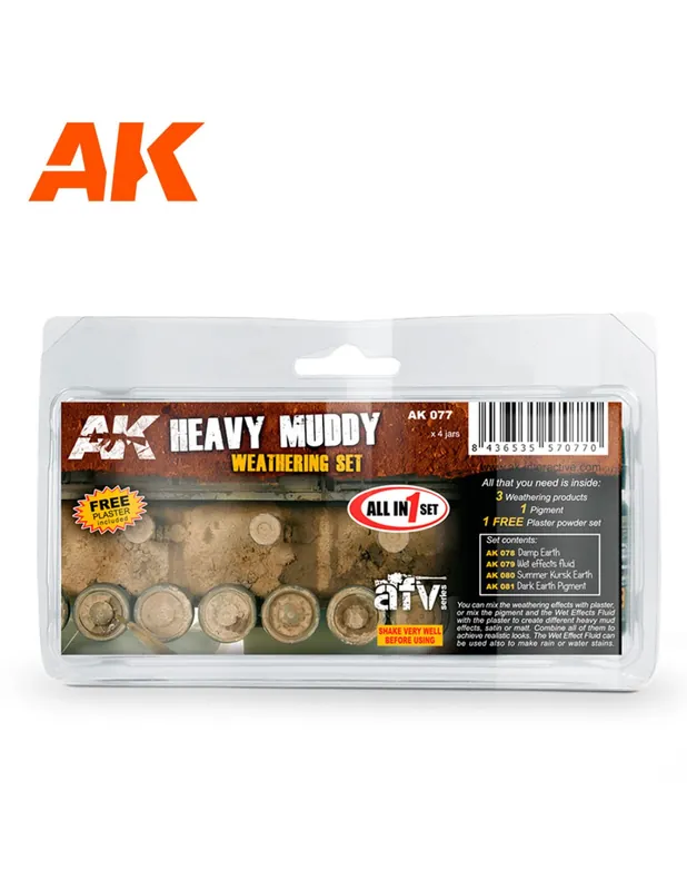 Un nuevo set muy completo que incluye diferentes productos para hacer efectos de barro en nuestros vehículos. Hemos diseñado un color muy especial basado en las estepas rusas, muy apropiado para la batalla de Kursk, aunque también puede ser utilizado en muchos lugares del mundo, en ambientes secos y calidos. También hemos creado un color de tierra húmeda o empapada, muy diferente a todos los demás tonos de nuestro catalogo. Para hacer barro con relieve y volumen, te regalamos un kit de escayola para que no tengas que buscarla y comiences cuanto antes a pintar tu maqueta. Por último hemos querido incluir el producto definitivo para hacer efectos de humedad, de lluvia o de de agua sobre un vehiculo. Este producto es muy diferente a los demás existentes en el mercado y el aspecto que da es de autentico realismo. El set se completa con un pigmento de color tierra oscura que servirá para mezclarlo con ambos, la escayola o el producto de efectos de agua y conseguir así efectos adicionales.