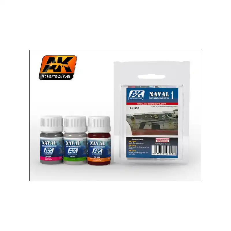 Este set contiene los productos AK-302 Lavado para cubiertas grises, AK-303 Lavado gris para barcos de la Kriegs marine y AK- 304 chorretones marrones para cascos rojos.