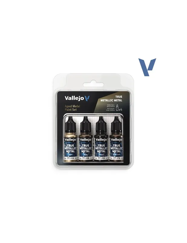 Vallejo presenta True Metallic Metal, una gama desarrolladapara ofrecer control, consistencia y resultados espectacularescon técnicas sencillas al pintar metales en miniaturas.La gama está diseñada para cubrir todo el espectro cromáticocon pinturas metalizadas, organizada en 20 familias cromáticas.Cada familia incluye cuatro subgamas que trabajan en perfecta armonía:BASE Tono metálico principal.LIGHT Color metálico de iluminación.SHADE Lavado satinado no metálico.AIRBRUSH Color base metálico formulado para aerógrafo.Cada familia cromática funciona como una unidad autónoma de color,pero está formulada para permitir combinaciones y mezclas entrefamilias cromáticas. Así, puedes crear transiciones de color, reflejoscruzados o juegos de temperatura sin perder coherencia visual.Un tono metálico pardo, desaturado y sobrio. Diseñado para evocar superficies desgastadas por el tiempo. Ideal para máquinas de guerra, paneles sci-fi, armaduras medievales o escenografías.Contenido:4 x 18 ml/0.6 fl oz True Metallic Metal77.119 Metal Envejecido (Light)77.139 Metal Envejecido (Base)77.159 Metal Envejecido (Shade)77.179 Metal Envejecido (Airbrush)