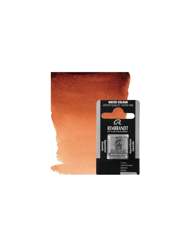 LasACUARELArelas Rembrandt están hechas con los pigmentos más puros y la mejor calidad de goma arábiga.Máxima transparencia, los colores conservan su luminosidad, máximo grado de resistencia a la luz.Las ACUARELArelas extra finas Rembrandt están exclusivamante fabricadas con materias primas de primera calidad y siguiendo los métodos de producción más modernos.ACUARELA REMBRANDT MEDIA PASTILLA 378 ROJO OXIDO TRANSPARENTE S2