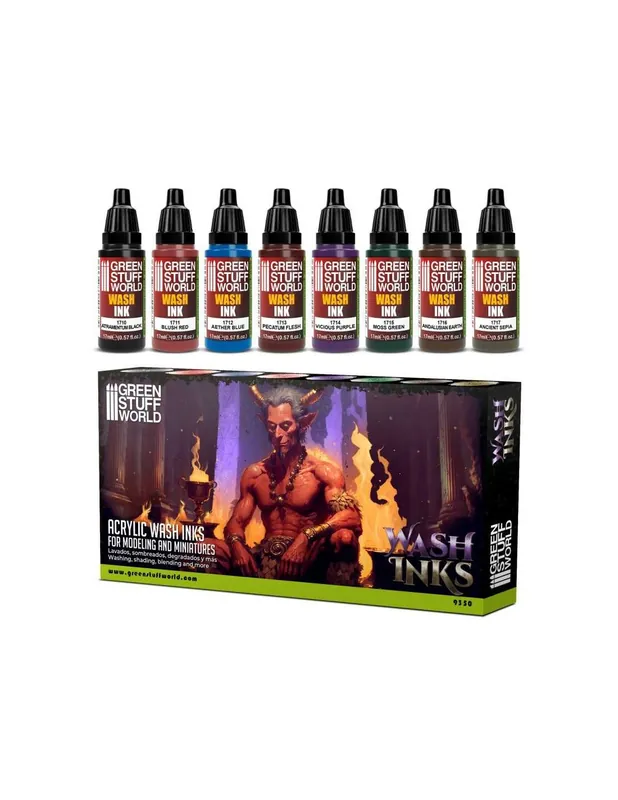 Set 8x Tintas de LavadoGama de tintas de lavado Green Stuff World cuidadosamente formuladas para que fluya entre las grietas, pliegues y otros recovecos sutiles de tus figuras, proporcionando un sombreado natural y resaltando los detalles con precisión y facilidad. Acabado mate.Pintura acrílica no tóxica. No inflamable. Sin latex.Válido para pincel y aerógrafo.Contiene: 8 tintas de lavado de 17ml1x Atramentum Black1x Blush Red1x Aether Blue1x Pecatum Flesh1x Vicious Purple1x Moss Green1x Andalusian Earth1x Ancient Sepia