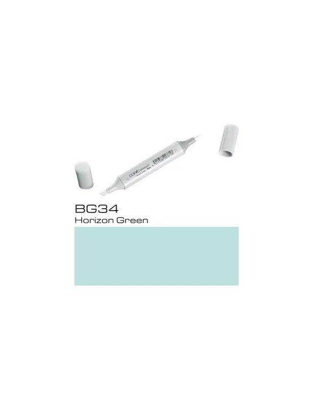 ROTULADOR COPIC SKETCH BG34 Horizon GreenCOPIC SKETCH BG34 Horizon GreenLos rotuladores copic sketch son los rotuladores preferidos de los profesionales del diseño, la ilustración, el dibujo manga y el scrap.Con sus 358 colores tienes todo un mundo de posibilidades a tu alcance, es la mayor gama de colores que existe en rotuladores, dificilmente no encontrarás aquella tonalidad que estás buscando.El rotulador copic sketch tiene dos puntas: una biselada para colorear grandes áreas y otra de pincel muy flexible ideal para dibujar. Las puntas se pueden cambiar cuando se gastan.Son rotuladores recargables, se puede volver a aprovechar la carcasa, con un frasco de tinta copic ink de 25 cc puedes rellenar hasta 12 veces un sketch.La tinta copic es a base de alcohol, es permanente y no es tóxica. Cuando se seca está libre de ácido.Los rotuladores copic sketch se pueden utilizar también con el sistema de aerografia copic.