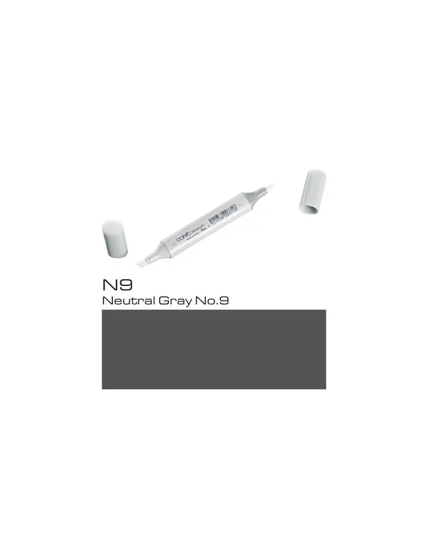 ROTULADOR COPIC SKETCH N9 Neutral Gray No.9COPIC SKETCH N9 Neutral Gray No.9Los rotuladores copic sketch son los rotuladores preferidos de los profesionales del diseño, la ilustración, el dibujo manga y el scrap.Con sus 358 colores tienes todo un mundo de posibilidades a tu alcance, es la mayor gama de colores que existe en rotuladores, dificilmente no encontrarás aquella tonalidad que estás buscando.El rotulador copic sketch tiene dos puntas: una biselada para colorear grandes áreas y otra de pincel muy flexible ideal para dibujar. Las puntas se pueden cambiar cuando se gastan.Son rotuladores recargables, se puede volver a aprovechar la carcasa, con un frasco de tinta copic ink de 25 cc puedes rellenar hasta 12 veces un sketch.La tinta copic es a base de alcohol, es permanente y no es tóxica. Cuando se seca está libre de ácido.Los rotuladores copic sketch se pueden utilizar también con el sistema de aerografia copic.