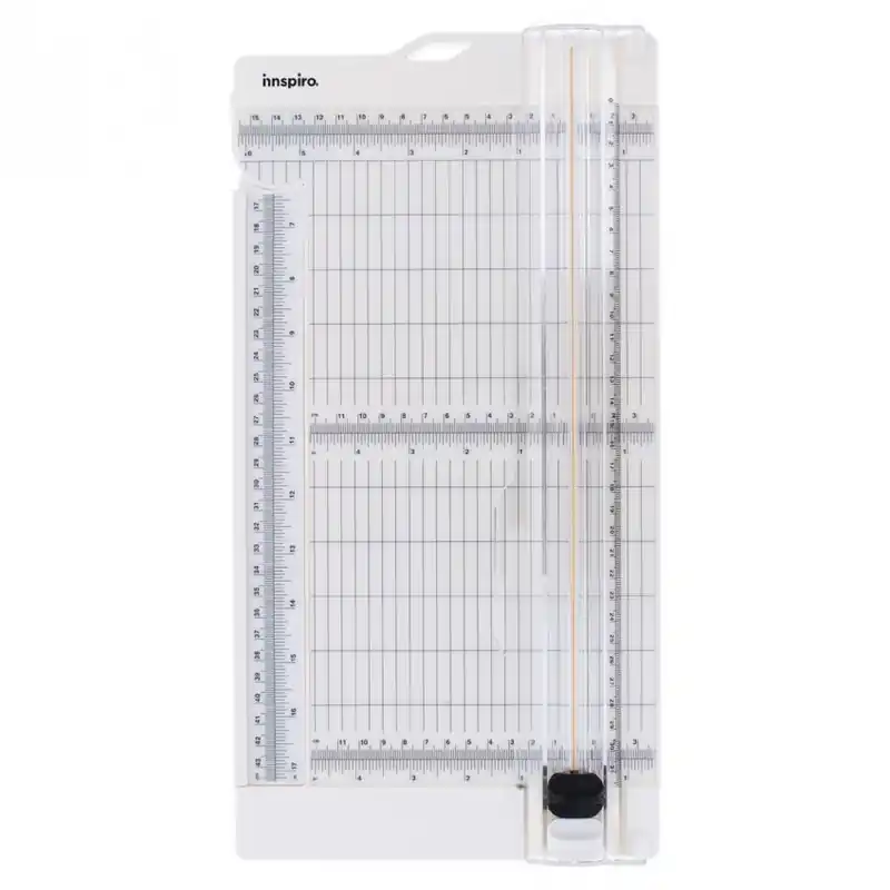 La cizalla para scrap es una de las mejores y más versátiles herramientas de corte para papel, cartón, cartulina y acetatos finos. Algunas personas también la llaman guillotina aunque normalmente la guillotina es la que tiene una palanca de corte en un lateral.La cuadrícula de medición está impresa de forma permanente sobre la base. Además, posee una regla desplegable que permite ampliar el área de medición para papeles de hasta 49 X 30 cm. La cizalla grande es la mejor de los tres modelos ya que permite hacer los cortes de mayor distancia y apoyar el papel más firmemente. Si bien las otras cizallas también funcionan estupendamente.La regla extensible se apoya con firmeza y no balancea. La regla que contiene las cuchillas es transparente y permite ver el papel de scrap por debajo. Tiene cuchilla de corte, la negra, y cuchilla de marcado, la blanca. Las cuchillas son reemplazables y se pueden comprar por separado. Esto es muy importante. Es normal que con el uso de cualquier cizalla las cuchillas vayan perdiendo el filo. Si no puedes comprar cuchillas porque es una marca extranjera o no tiene recambios, no podrás seguir usando tu cizalla.Es importante que un buen aficionado al scrapbooking seleccione buenos materiales y útiles ya que los va a emplear muchas veces y mucho tiempo. Hemos seleccionado este modelo de la marca española Innspiro porque tiene una magnífica calidad y un precio muy equilibrado. Corta muy bien y es más barata que otras marcas como Fiskars.Los números se leen con claridad y tienes tres reglas para el correcto posicionamiento del papelSi quieres ver un video demostrativo de cómo utilizarlo haz clic aquí.