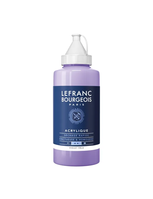 Pintura acrílica fina Fabricado con pigmentos seleccionados para una mejor solidez del color y brillo en el ámbito artístico, de diseño y de hobbies. Colores vivos: los colores se caracterizan por su textura cremosa y homogénea y convencen con un brillo excepcional y una profundidad de color y una muy buena opacidad. Resistencia a la luz: los colores acrílicos son resistentes al envejecimiento y no amarillean, solo se han seleccionado pigmentos con alta o alta resistencia a la luz. Superficies para pintar: los colores se adhieren a todas las superficies de pintura sin grasa y sin polvo, por ejemplo: papel, cartón, madera, tela, plásticos, vidrio, metal.. ACR.LEFRAN 750ML VIOLETA PÁLIDO