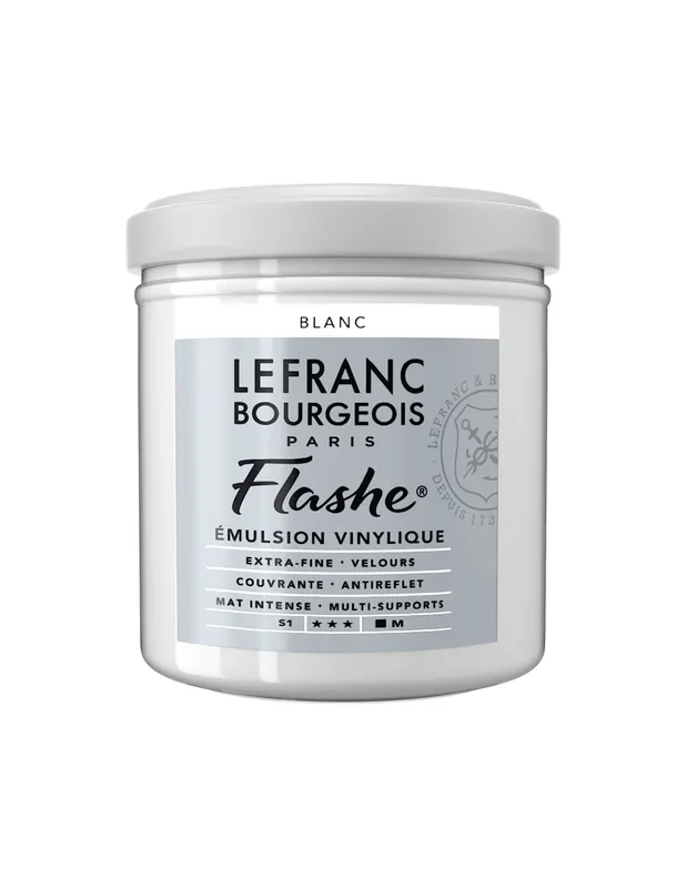Pintura muy mate , aterciopelada y opaca. Se diluye con agua y se vuelve indeleble una vez seco. Se puede aplicar con pincel, brocha o esponja. Es un producto muy polivalente que ofrece múltiples utilidades como la pintura en tela, decoración interior, preparación de fondos para óleo o acrílico etc. Formato 125 ml presentado en bote de cristal LEFRANC BOURGEOIS ACRILICO FLASHE 125ML Blanco