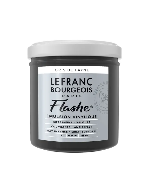 Pintura muy mate , aterciopelada y opaca. Se diluye con agua y se vuelve indeleble una vez seco. Se puede aplicar con pincel, brocha o esponja. Es un producto muy polivalente que ofrece múltiples utilidades como la pintura en tela, decoración interior, preparación de fondos para óleo o acrílico etc. Formato 125 ml presentado en bote de cristal LEFRANC BOURGEOIS ACRILICO FLASHE 125ML Gris de payne