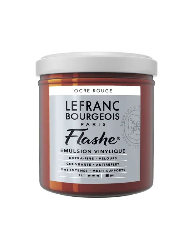 Pintura muy mate , aterciopelada y opaca. Se diluye con agua y se vuelve indeleble una vez seco. Se puede aplicar con pincel, brocha o esponja. Es un producto muy polivalente que ofrece múltiples utilidades como la pintura en tela, decoración interior, preparación de fondos para óleo o acrílico etc. Formato 125 ml presentado en bote de cristal LEFRANC BOURGEOIS ACRILICO FLASHE 125ML Ocre rojo