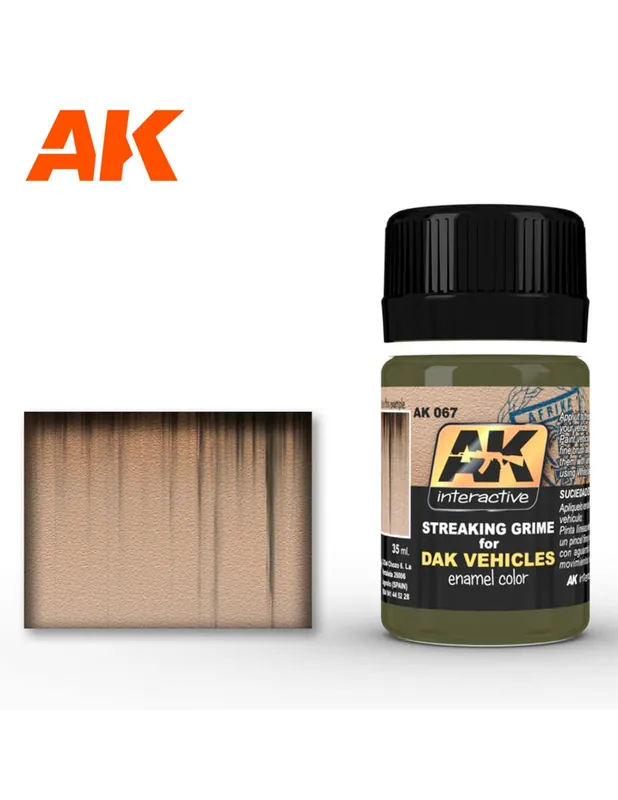 Efectos de suciedad escurrida específicamente diseñado para vehículos pintados en color arena claro, utilizados en el Norte de África, es especial para tanques alemanes del DAK. Pero también puede ser muy útil para cualquier vehículos pintado en colores claros desérticos. Agítalo muy bien y después dibuja líneas verticales irregulares en los laterales de tu vehiculo y después difumínalas con un pincel ancho y plano usando un poco de nuestro White Spirit