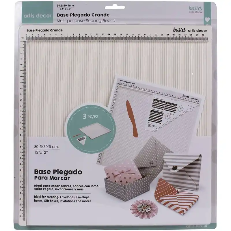 TABLA PARA PLEGADO GRANDE 12X12'' (30,5×30,5 CM) ARTIS DECORLa tabla de plegado de tamaño grande multi usos Artis Decor es perfecta para crear sobres, cajas, tarjetas, invitaciones, carpetas y muchas cosas más.Las hendiduras para plegar están distribuidas por pulgadas, poniendo el vinilo adhesivo incluido, podrás plegar con estas medidas y orientarte en centímetros gracias al marcaje superior de la tabla.Incluye una plegadera para hacer los hendidos, y una placa adaptador con dos posiciones y tablas con referencias para realizar sobres, sobres caja y cajas. Tanto la plegadera como la tabla se pueden guardar en su propio compartimento.