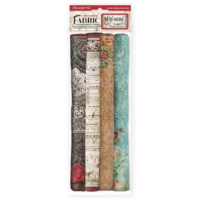 Set de 4 Telas de Encuadernar Desire Stamperia 30×30 cm.La tela ofrece grandes prestaciones para hacer trabajos de estampación con foil, embossing y serigrafía. Su uso es ideal para encuadernar libros, libretas, álbumes de fotos, archivadores, menus y también para forrar cajas de cartón o madera, adaptándose su uso al scrapbooking y a las manualidades en general.Se pega con cola blanca especial de encuadernar.Composición: 100% poliéster.Tamaño: 30 x 30 cm