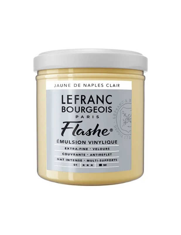Pintura muy mate , aterciopelada y opaca. Se diluye con agua y se vuelve indeleble una vez seco. Se puede aplicar con pincel, brocha o esponja. Es un producto muy polivalente que ofrece múltiples utilidades como la pintura en tela, decoración interior, preparación de fondos para óleo o acrílico etc. Formato 125 ml presentado en bote de cristal LEFRANC BOURGEOIS ACRILICO FLASHE 125ML Amarillo de Nápoles claro