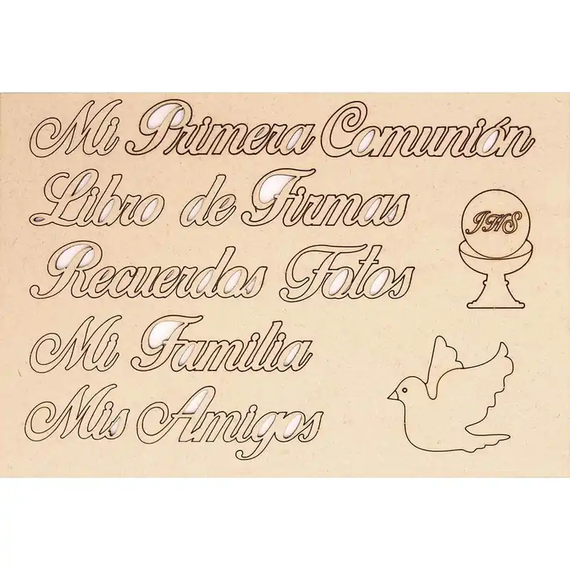 KIT PALABRAS COMUNION DM.Kit de palabras para comunión (dm) 2,5mm.de espesor.Mi Primera Comunión (19,2×2,2cm.)Libro de firmas (14,4×21,9cm.)Recuerdos (9×2,2cm.)Fotos (5×2,2cm.)Mi Familia (10,7×2,2cm.)Mis Amigos (11,3×2,8cm.)Silueta Cáliz (2,8×4,5cm.)Silueta paloma (4,7×4,4cm.)