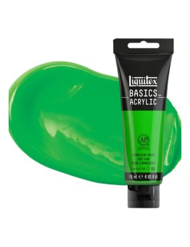 Pintura acrílica de viscosidad media, que marca los picos y pinceladas. Contiene pigmentos finos permanentes. Acabado satinado para todos los colores después del secado. Miscible con todos los otros productos acrílicos Liquitex (mediums y pinturas). Ideales para formar la rueda de color y mezcla de colores. Todos los colores llevan la etiqueta AP ACMI y se pueden utilizar de forma segura para la enseñanza. Usos y técnicas: Técnicas pastosas: por capas más gruesas que revelan las pinceladas y marcas de cuchillo o espátula. Pintura acrílica para aplicar sobre tela tradicional o panel, facilita la mezcla LIQUITEX ACRILICO BASICS 118ML VERDE FLUORESCENTE