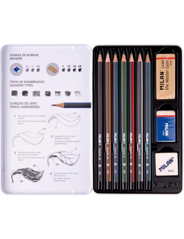 SET LAPICEROS GRAFITO MILAN (2H, H, HB, B, 2B, 4B y 6B) + 1 goma The Master Gum + goma 2424+ 1 sacapuntas AFILA