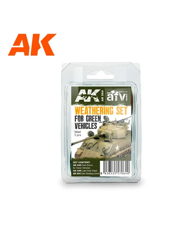 Tres productos de envejecido para los amantes de los vehículos verdes. El set incluye los colores AK 024, AK 045 y AK046, para hacer efectos de escurridos y lavados oscuros y de color oxido. Los tres colores se venden por el mismo precio que separados, pero están reunidos en un set para personas que quieran iniciarse en el mundo de los efectos de pintura o por comodidad de tener los tres colores en un mismo pack.