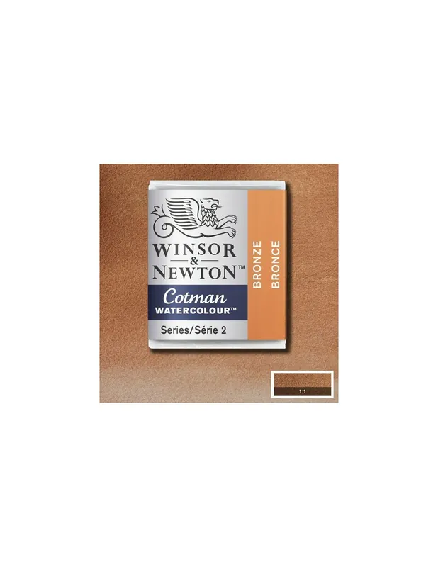 Viveza, transparencia y pureza de color. Gama de colores complementaria de la serie Artists’ de Winsor & Newton, caracterizada por una concentración menor de pigmento y la sustitución de los pigmentos más caros por otros más económicos. Así, W&N consigue a un precio único una acuarela de excelente poder colorante y optima transparencia a precio muy asequible. WINSOR & NEWTON ACUARELA COTMAN 1/2 GODET BRONCE