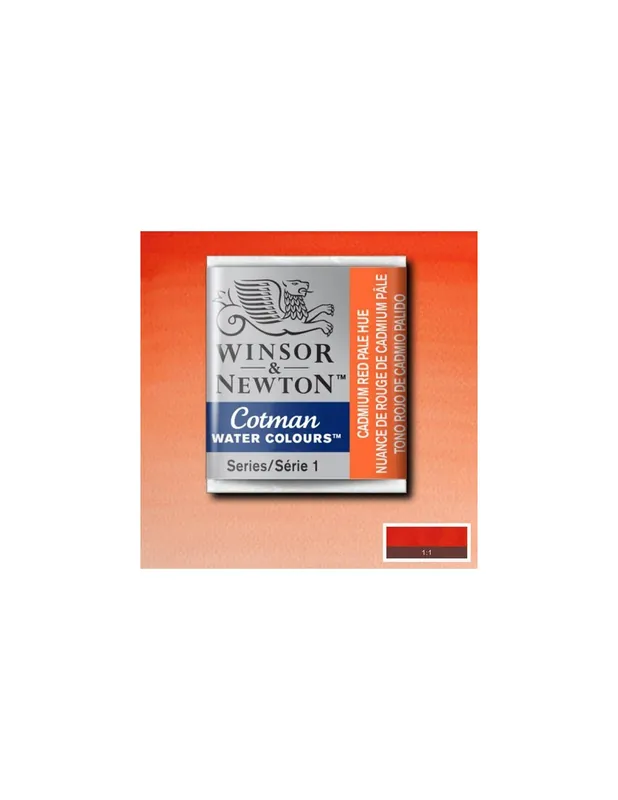 Viveza, transparencia y pureza de color. Gama de colores complementaria de la serie Artists’ de Winsor & Newton, caracterizada por una concentración menor de pigmento y la sustitución de los pigmentos más caros por otros más económicos. Así, W&N consigue a un precio único una acuarela de excelente poder colorante y optima transparencia a precio muy asequible. WINSOR & NEWTON ACUARELA COTMAN 1/2 GODET TONO ROJO DE CADMIO PÁLIDO